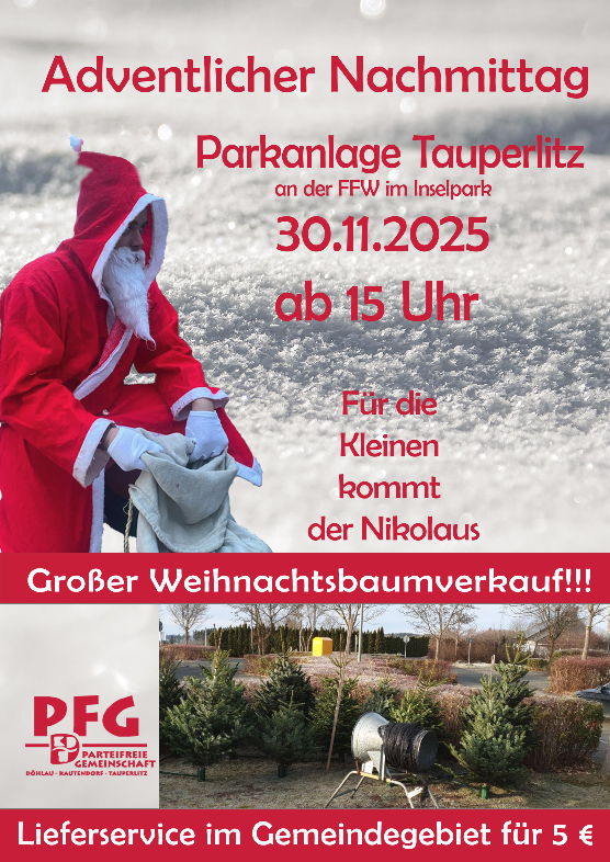 Taucht ein in die stimmungsvolle Vorweihnachtszeit! Am 1. Advent laden wir herzlich zum adventlichen Nachmittag im Inselpark Tauperlitz ein. Genießt ein paar gemütliche Stunden in festlicher Atmosphäre – mit Lichterglanz, Musik und duftenden Leckereien. Für das leibliche Wohl ist natürlich bestens gesorgt – lasst euch überraschen, was unsere fleißigen Helfer vorbereitet haben! Auch für die kleinen Gäste gibt es ein besonderes Highlight: 🎅 Der Nikolaus kommt persönlich vorbei! Und wer noch auf der Suche nach dem perfekten Weihnachtsbaum ist, wird bei unserem großen Christbaumverkauf sicher fündig. Auf Wunsch liefern wir euren Baum sogar bequem im Gemeindegebiet Döhlau nach Hause – für nur 5 €. Kommt vorbei, bringt Familie und Freunde mit und stimmt euch gemeinsam mit uns auf die schönste Zeit des Jahres ein!