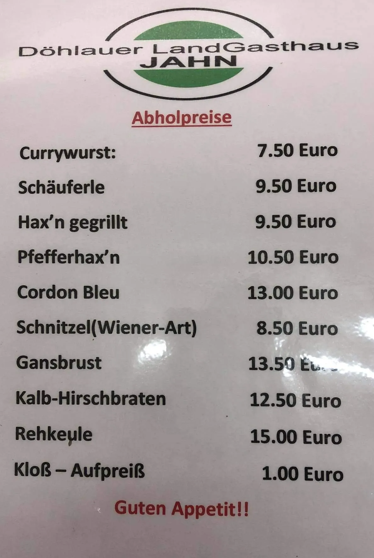 Familie Jahn ist bekannt für die deutsche Küche. Ob Klassiker wie Schnitzel, leckerer Rehbraten oder der legendäre Jahn-Pfefferhax'n: hier findet jeder sein passendes Essen. Holen Sie sich Ihr deftiges Essen von Mittwoch bis Samstag ab 17 Uhr und Sonntag Mittag ab 11:00 bei uns ab. Bitte Vorbestellung unter der Telefonnummer 09286/587