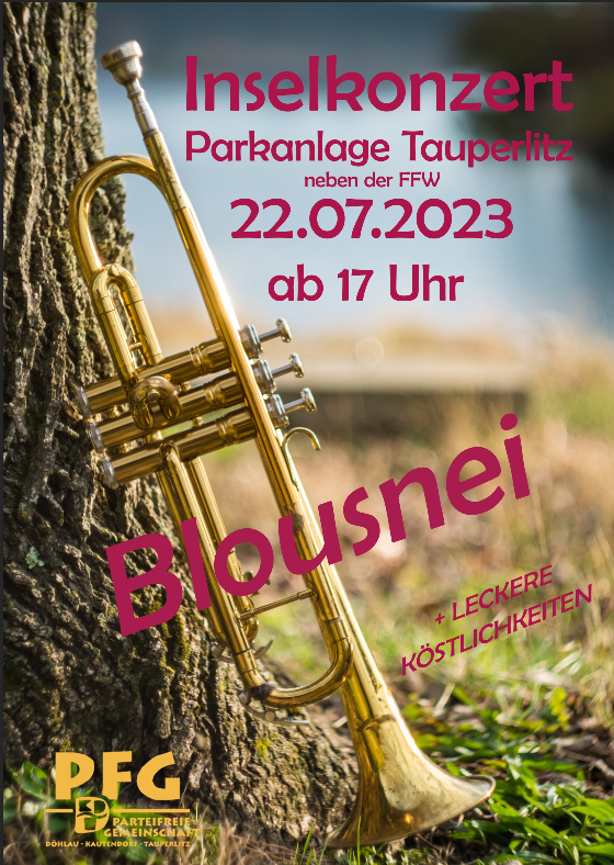 Organisiert von der Parteifreien Gemeinschaft Döhlau-Kautendorf-Tauperlitz gibt das von Topmusikern neu gegründete Blasensemble "Blousnei" ab 17 Uhr ein Inselkonzert.