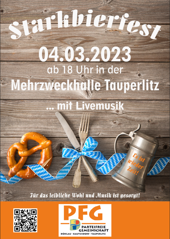 Zu einem Besuch unseres traditionellen Starkbierfestes am 04. März 2023 laden wir ab 18 Uhr herzlich in die Mehrzweckhalle nach Tauperlitz ein. Lasst Euch von ausgewählten Bierspezialitäten, deftigen fränkischen Brotzeiten und zünftiger Live-Musik verwöhnen.