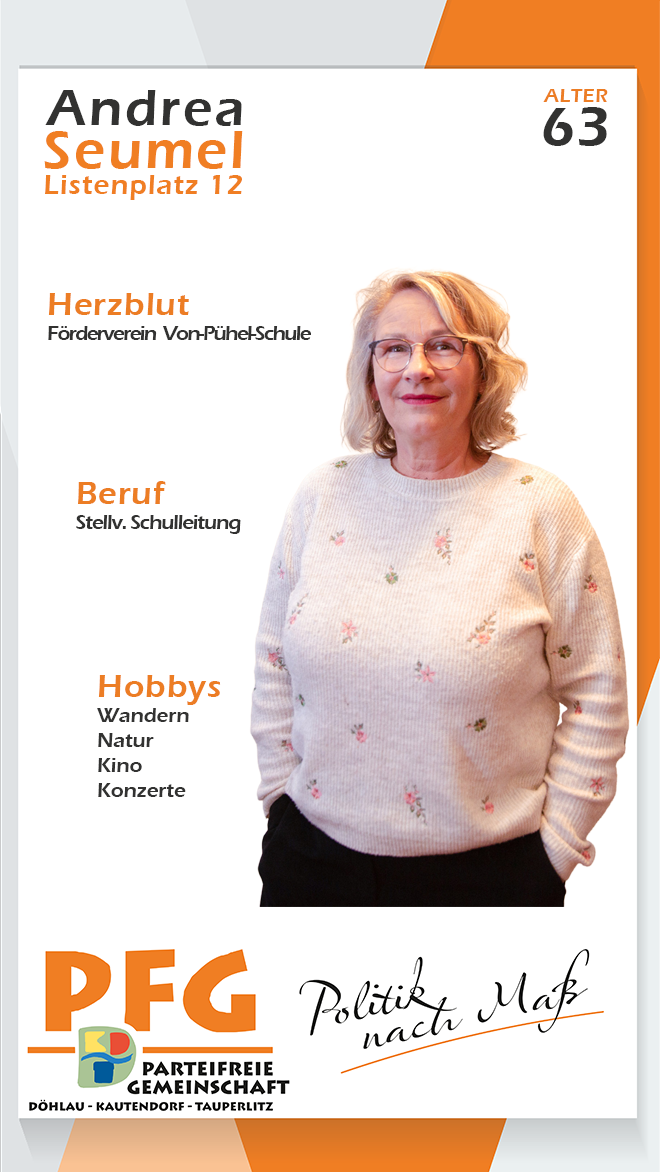Unserer Andrea ist stellvertretende Schulleiterin und bringt nicht nur fachliche Kompetenz, sondern vor allem viel Herzblut mit. Bildung, Gemeinschaft und ein gutes Miteinander liegen ihr besonders am Herzen. In ihrer Freizeit tankt sie Energie beim Wandern in der Natur, genießt Kinobesuche oder lässt sich von Konzerten begeistern. Ein ganz besonderes Anliegen ist ihr der Förderverein der Von-Pühel-Schule in Tauperlitz, für den sie sich mit großem Engagement einsetzt – weil ihr die Zukunft unserer Kinder wichtig ist. Mit ihrer Erfahrung, ihrem Einsatz und ihrer Bodenständigkeit möchte Andrea Seumel aktiv dazu beitragen, unsere Gemeinde weiter positiv mitzugestalten.