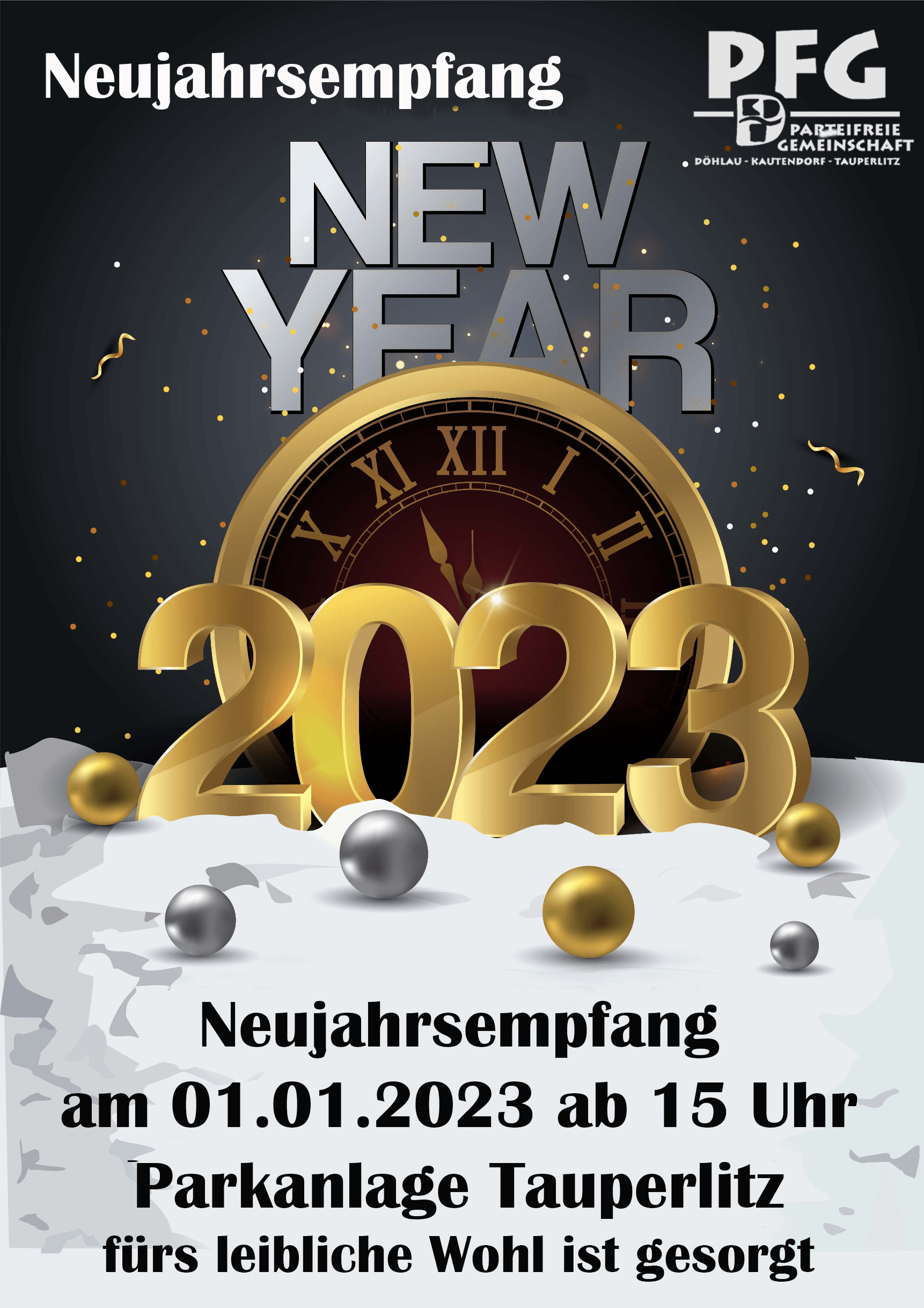 Liebe Mitbürger, wir laden Sie herzlich zu unserem Neujahrsempfang am 1. Januar 2025 um 15:30 Uhr in der Parkanlage Tauperlitz (neben der Freiwilligen Feuerwehr) ein. Lassen Sie uns gemeinsam auf das neue Jahr 2025 anstoßen! Bei gutem Essen und Getränken möchten wir ein paar gemütliche Stunden miteinander verbringen. Treffen Sie alte Freunde, knüpfen Sie neue Bekanntschaften und genießen Sie die Zeit bei uns. Wir freuen uns auf Ihr Kommen und auf einen fröhlichen Start ins neue Jahr! Ihre PFG