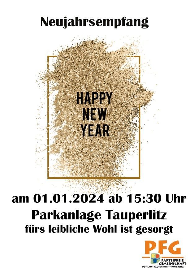 Liebe Mitbürger, wir laden Sie herzlich zu unserem Neujahrsempfang am 1. Januar 2025 um 15:30 Uhr in der Parkanlage Tauperlitz (neben der Freiwilligen Feuerwehr) ein. Lassen Sie uns gemeinsam auf das neue Jahr 2025 anstoßen! Bei gutem Essen und Getränken möchten wir ein paar gemütliche Stunden miteinander verbringen. Treffen Sie alte Freunde, knüpfen Sie neue Bekanntschaften und genießen Sie die Zeit bei uns. Wir freuen uns auf Ihr Kommen und auf einen fröhlichen Start ins neue Jahr! Ihre PFG