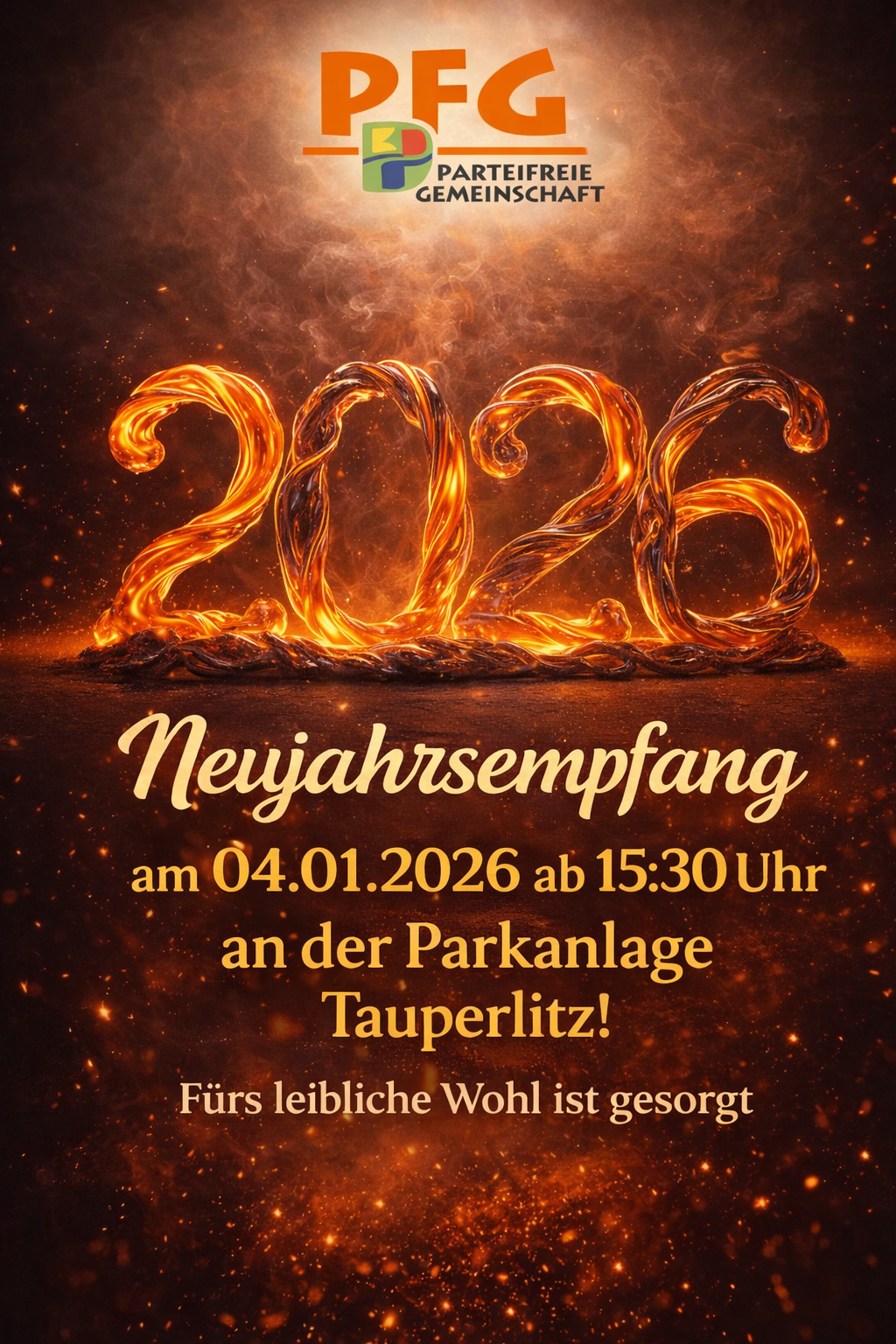 Neujahrsempfang 2026 der Parteifreien Gemeinschaft Mit einem gemeinsamen Blick nach vorne möchten wir das neue Jahr beginnen und laden herzlich zum Neujahrsempfang 2026 der Parteifreien Gemeinschaft (PFG) ein. 📅 Sonntag, 04. Januar 2026 🕞 Beginn: ab 15:30 Uhr 📍 Inselpark Tauperlitz (Parkanlage) Der Neujahrsempfang bietet die schöne Gelegenheit, in entspannter Atmosphäre zusammenzukommen, miteinander ins Gespräch zu kommen und gemeinsam auf das neue Jahr anzustoßen. Ob Mitglieder, Freunde, Unterstützer oder interessierte Bürgerinnen und Bürger – alle sind herzlich willkommen. Neben guten Gesprächen und einem geselligen Miteinander ist selbstverständlich auch für das leibliche Wohl bestens gesorgt. In gemütlicher Umgebung möchten wir gemeinsam Zeit verbringen, neue Kontakte knüpfen und bekannte Gesichter wiedersehen. Der Jahresanfang ist immer ein guter Moment, um zurückzublicken, nach vorne zu schauen und gemeinsam Ideen für die Zukunft auszutauschen. Genau dafür soll unser Neujahrsempfang Raum bieten – offen, persönlich und nah an den Menschen. Wir freuen uns sehr auf zahlreiche Besucherinnen und Besucher und einen gelungenen Start ins Jahr 2026 im Inselpark Tauperlitz. Ihre PFG