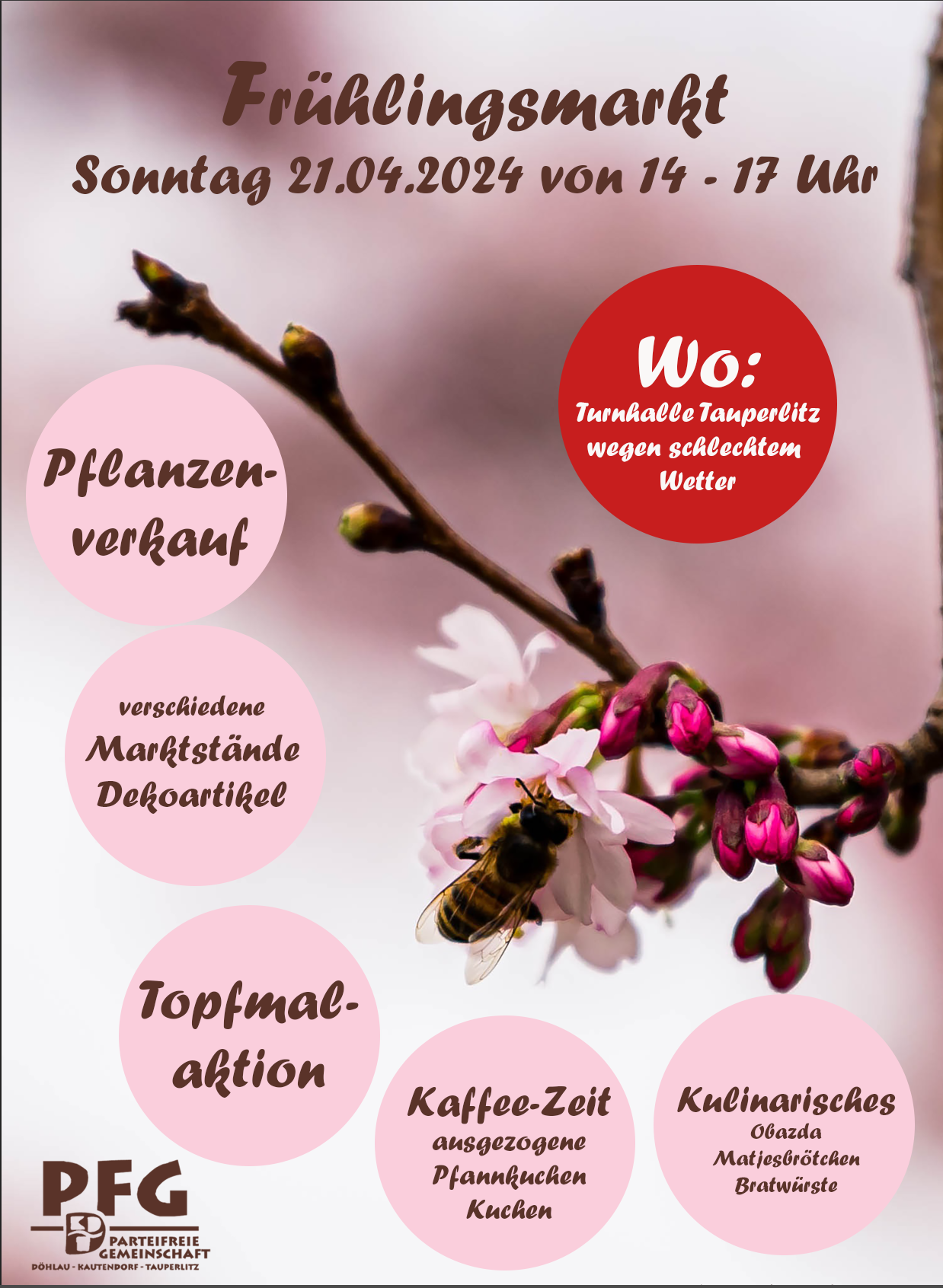 die ParteiFreie Gemeinschaft (PFG) lädt euch herzlich zu unserem Frühlingsmarkt am 21.4.2024 ab 14 Uhr ein! Freut euch auf eine Vielzahl von Marktständen mit handgemachten Produkten, frühlingshaften Dekorationen und leckerem Essen.